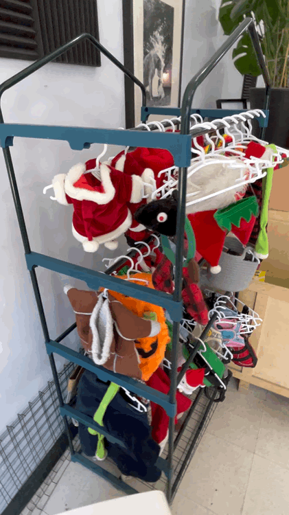 We have clothes, costumes, crates, muzzles, bowls, toys, diapers, hot water pads, leashes and collars and more.